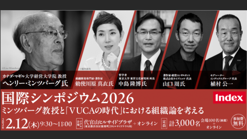 インデックスグループはこれまでに、思想家・経済学者のジャック・アタリさんやマイクロクレジットでノーベル平和賞を受賞したムハマド・ユヌスさん、ハーバード大学教授のマイケル・サンデルさん、『倫理資本主義』を唱えるドイツの哲学者、マルクス・ガブリエルさんを招いたシンポジウムを協賛・主催してきました。ミンツバーグ教授の今回のシンポジウムも、一連のシンポジウム企画の一環です。